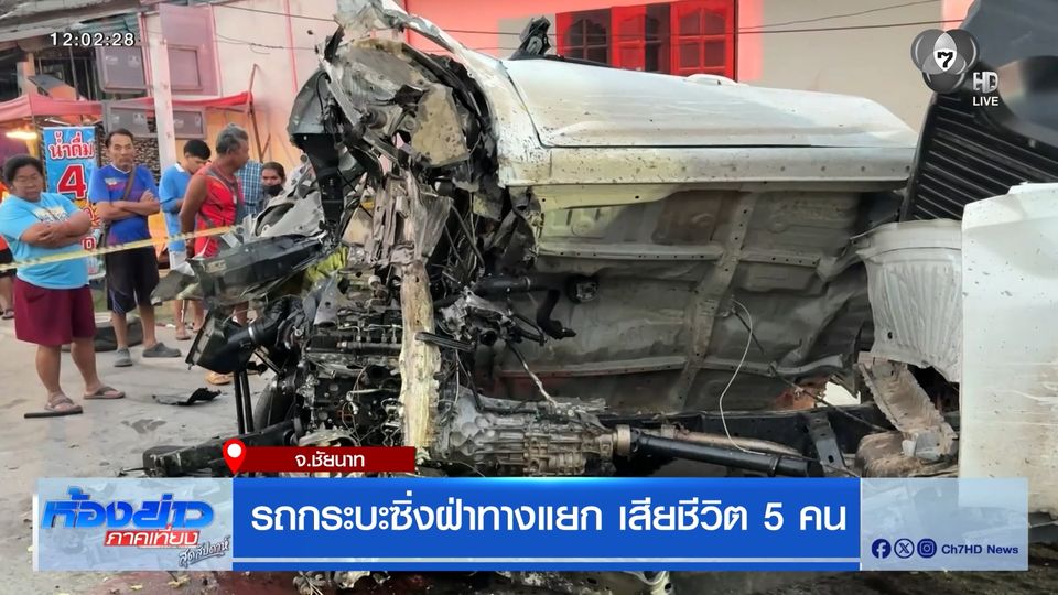 ห้องข่าวภาคเที่ยง สุดสัปดาห์ - รถกระบะซิ่งฝ่าทางแยก พุ่งชนเสาไฟฟ้า ตัวถังหลุด 2 ท่อน มีผู้เสียชีวิต 5 คน
