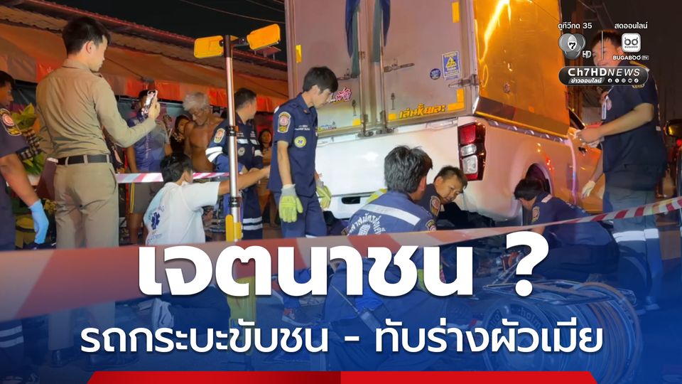 รถกระบะตู้ทึบชนรถ จยย. ขับทับซ้ำผัว-เมีย ดับกลางถนน ตร.คุมตัวสอบเข้มยังไม่ปักใจเชื่อคำให้การว่าเป็นอุบัติเหตุ ตกใจเหยียบคันเร่ง ญาติแฉคนขับเป็นแฟนเก่าของฝ่ายหญิง เคยพยายามขับชนมาแล้ว พยานในที่เกิดเหตุเห็นรถชนไม่แรง-ขับทับ