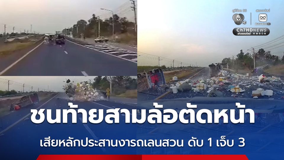 อุบัติเหตุระทึก รถกระบะคอกชนท้ายรถ จยย. สามล้อเบี่ยงตัดหน้า เสียหลักชนประสานงารถกระบะบรรทุกอาหารทะเล ดับ 1 เจ็บ 3 รถพังเละ อาหารทะเลกระจายเกลื่อนถนน