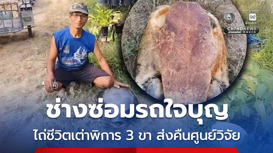 ช่างซ่อมรถใจบุญไถ่ชีวิตเต่ากระอานพิการเหลือ 3 ขา ที่ชาวบ้านจับได้ขณะหาปลา นำส่งคืนศูนย์วิจัย เพราะคาดว่าน่าจะเป็นพ่อแม่พันธ์ที่หลุดออกไปจากศูนย์วิจัยช่วงน้ำท่วมเต่ากระอาน