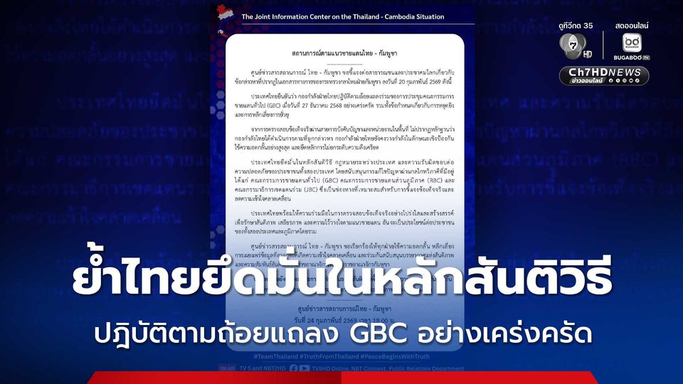 ประเทศไทย ยืนยันว่า กองกำลังฝ่ายไทยปฏิบัติตามถ้อยแถลงร่วมของการประชุมคณะกรรมการชายแดนทั่วไป (GBC) เมื่อวันที่ 27 ธันวาคม 2568 อย่างเคร่งครัด รวมทั้งข้อกำหนดเกี่ยวกับการหยุดยิง และการหลีกเลี่ยงการยั่วยุ
