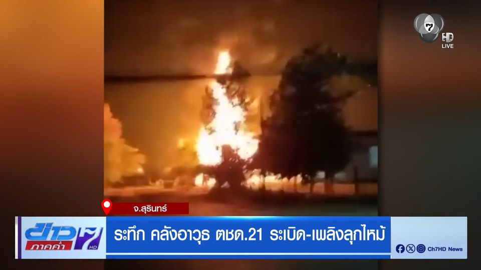 เป็นภาพเหตุการณ์เมื่อเวลาประมาณ 19.30 น. ที่ผ่านมา มีรายงานข่าวว่า เกิดเหตุคลังอาวุธ กองกำกับการตำรวจตระเวนชายแดนที่ 21 จังหวัดสุรินทร์ เกิดการระเบิดขึ้น โดยแรงระเบิดทำให้อาคารในพื้นที่ได้รับแรงสั่นสะเทือน และมีเสียงระเบิดดังต่อเนื่อง ก่อนเกิดเพลิงลุกไหม้อย่างรุนแรง โดยอาคารที่ใกล้สุดระยะ 3 กิโลเมตร คือ มหาวิทยาลัยราชภัฏสุรินทร์ เบื้องต้นเจ้าหน้าที่อยู่ระหว่างการระงับความเสียหาย ขณะที่รายงานข่าวระบุว่า ความเสียหายเกิดขึ้นเพียงส่วนหนึ่งของคลังเก็บอาวุธเท่านั้น ความคืบหน้า ติดตามในข่าวช่วงต่อไป