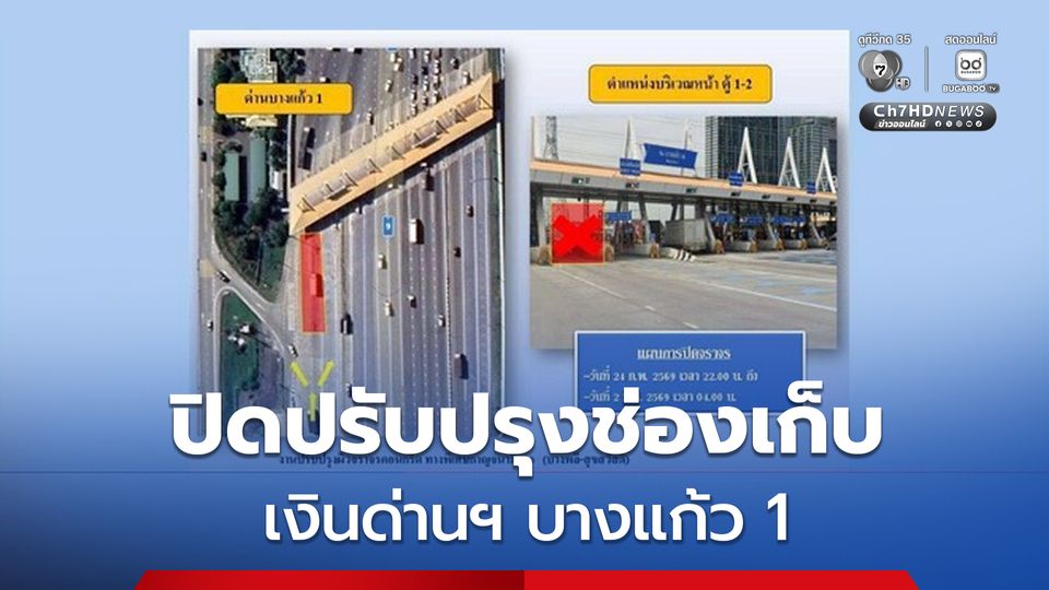 โดยผู้รับจ้างจะเข้าดำเนินงานปรับปรุงผิวจราจรบริเวณหน้าช่องเก็บค่าผ่านทางพิเศษ ช่องที่ 1 และ 2 ของด่านเก็บค่าผ่านทางพิเศษบางแก้ว 1 จึงมีความจำเป็นจะต้อง ปิดช่องเก็บค่าผ่านทางพิเศษ ช่องที่ 2 ของด่านเก็บค่าผ่านทางพิเศษบางแก้ว 1 ทางพิเศษกาญจนาภิเษก (บางพลี-สุขสวัสดิ์) ตั้งแต่วันที่ 24 ก.พ. 69 เวลา 22.00 น. ถึงวันที่ 2 มี.ค. 69 เวลา 04.00 น. .