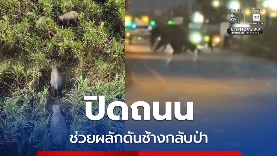 ชาวบ้าน - เจ้าหน้าที่ ปิดถนนสาย 344 ช่วยผลักดัน 2 ช้างป่ากลับคืนสู่ธรรมชาติ หลังผลัดหลงมาปักหลักพักผ่อนในป่าอ้อย