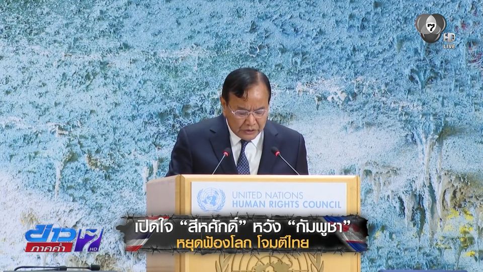 ข่าวภาคค่ำ - เวทีการประชุมระดับสูงของคณะมนตรีสิทธิมนุษยชนแห่งสหประชาชาติ ที่นครเจนีวา ถูกจัดขึ้นเพื่อให้นานาประเทศ ใช้เป็นเวทีสะท้อนปัญหา และแนวทางการแก้ไข การถูกสะเมิดสิทธิมนุษยชน ในด้านต่าง ๆ แต่กัมพูชากลับใช้โอกาสนี้พูดโจมตีไทย แต่ไทยยืนยัน เราถูกรุกล้ำดินแดน มานานแล้ว ไปติดตามจากรายงานของ คุณอรรถพล ภิญโญ