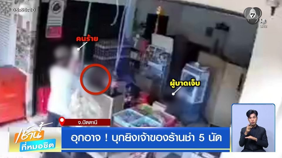 เช้านี้ที่หมอชิต - อุกอาจ 2 คนร้าย บุกยิงเจ้าของร้านชำ 5 นัด ขณะนั่งกินข้าวอยู่ที่ร้าน ไม่ทันได้ตั้งตัว ตำรวจกำลังสืบว่าเป็นเรื่องส่วนตัว หรือความไม่สงบในพื้นที่ชายแดนใต้