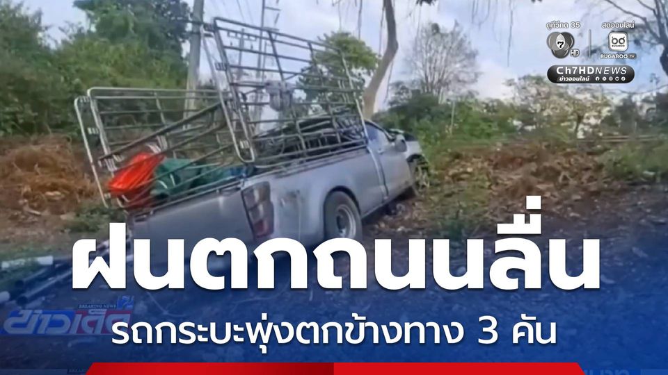 ข่าวเด็ด 7 สี - ที่จังหวัดระยอง ฝนตกถนนลื่น ปรากฏว่าเกิดอุบัติเหตุ รถกระบะ 3 คันเสียหลักพุ่งตกคูน้ำโค้งประปาเขาดิน