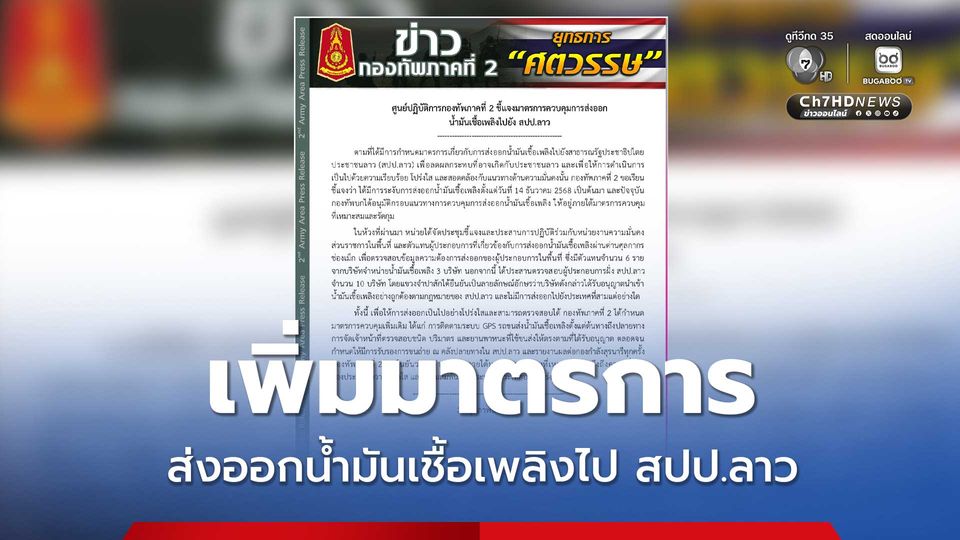 ตามที่ได้มีการกำหนดมาตรการเกี่ยวกับการส่งออกน้ำมันเชื้อเพลิงไปยังสาธารณรัฐประชาธิปไตยประชาชนลาว (สปป.ลาว) เพื่อลดผลกระทบที่อาจเกิดกับประชาชนลาว และเพื่อให้การดำเนินการเป็นไปด้วยความเรียบร้อย โปร่งใส และสอดคล้องกับแนวทางด้านความมั่นคงนั้น กองทัพภาคที่ 2 ขอเรียนชี้แจงว่า ได้มีการระงับการส่งออกน้ำมันเชื้อเพลิงตั้งแต่วันที่ 14 ธันวาคม 2568 เป็นต้นมา และปัจจุบันกองทัพบกได้อนุมัติกรอบแนวทางการควบคุมการส่งออกน้ำมันเชื้อเพลิง ให้อยู่ภายใต้มาตรการควบคุมที่เหมาะสมและรัดกุม