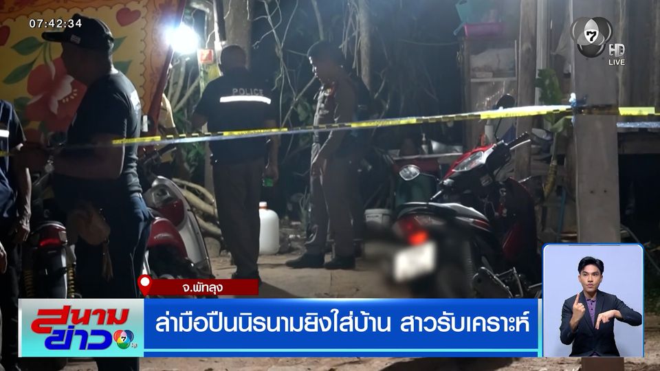 สนามข่าว 7 สี - มือปืนปริศนาบุกยิงปืนใส่บ้านพักในจังหวัดพัทลุง หญิงสาว อายุ 22 ปี รับเคราะห์ โดนกระสุนบาดเจ็บ