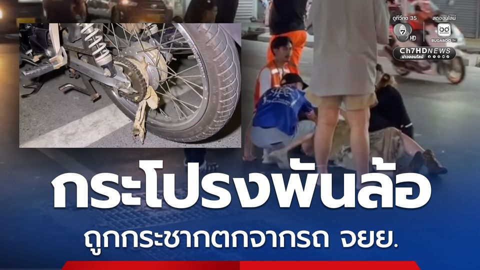 อุทาหรณ์เตือนภัย! สาวชาวต่างชาติใส่กระโปรงยาวนั่งซ้อนท้ายวิน จยย. สุดท้ายชายกระโปรงเข้าไปพันล้อกับโซ่จนถูกกระชากตกจากรถได้รับบาดเจ็บ