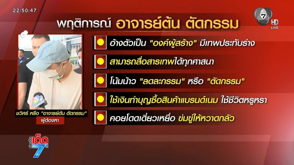 ที่ตำรวจสอบสวนกลาง รับแจ้งความมา พบว่าพฤติการณ์ "อาจารย์ต้น" จะอ้างตัวว่ามีเทพประทับร่าง กลายเป็น "องค์พระผู้สร้าง" สมรู้ร่วมคิดกับภรรยา ตั้งสำนักปฏิบัติธรรม แรก ๆ ก็เทศนาธรรมเรียบง่าย หมั่นทำความดี แต่พอหลงเลื่อมใสศรัทธาฝากตัวเป็นศิษย์ "อาจารย์ต้น" ก็เริ่มเปลี่ยนไป จากทำบุญที่ไหนก็ได้ กลายเป็นต้องทำกับ "อาจารย์ต้น" เท่านั้น โอนผิดบัญชีผีที่ตามรังควานอยู่ก็จะไม่ไป ใครหัวขึ้นกากบาทแสดงว่าจะตายก่อนไว ให้รีบโอนเงิน ตอนนี้เพิ่งมีผู้เสียหาย 14 คน โอนเงินตัดกรรม รวมความเสียหายกว่า 15 ล้านบาท ตั้งสติได้เข้าแจ้งความ ส่วนคดีของ "ไฮโซดาต้า" ถูกหลอกให้ซื้อที่ดินสร้างสถานปฏิบัติธรรมและบริจาคเงิน รวมกว่า 50 ล้านบาท ได้แยกเป็นอีกคดี