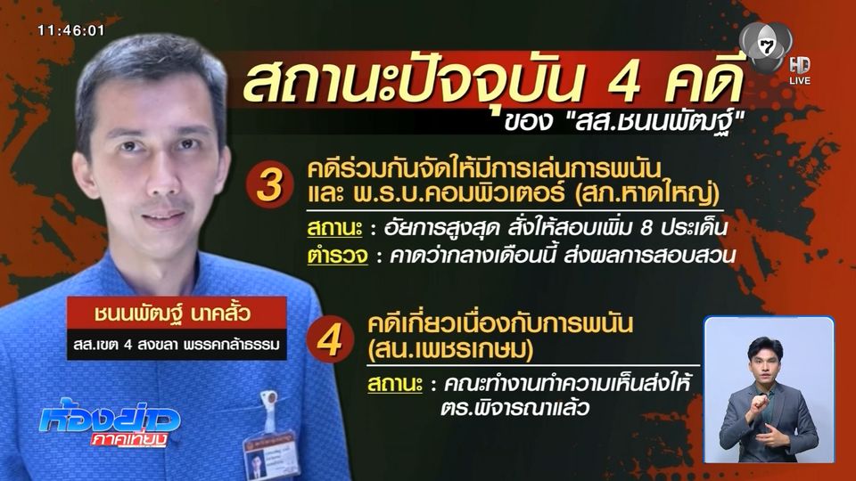 ห้องข่าวภาคเที่ยง - มีเรื่องให้ต้องจับตากันอีกแล้ว DSI ปปง. และกระทรวงยุติธรรม จะแถลงผลคดีเกี่ยวกับการปราบปรามเว็บฯ พนัน ที่เกี่ยวข้องกับนักการเมือง แล้วมีข่าวว่าเมื่อวาน DSI และ ปปง. เพิ่งไปค้นบ้านของ "สส.ชนนพัฒฐ์" มา จึงสงสัยว่า น่าจะเกี่ยวข้องกับเรื่องนี้