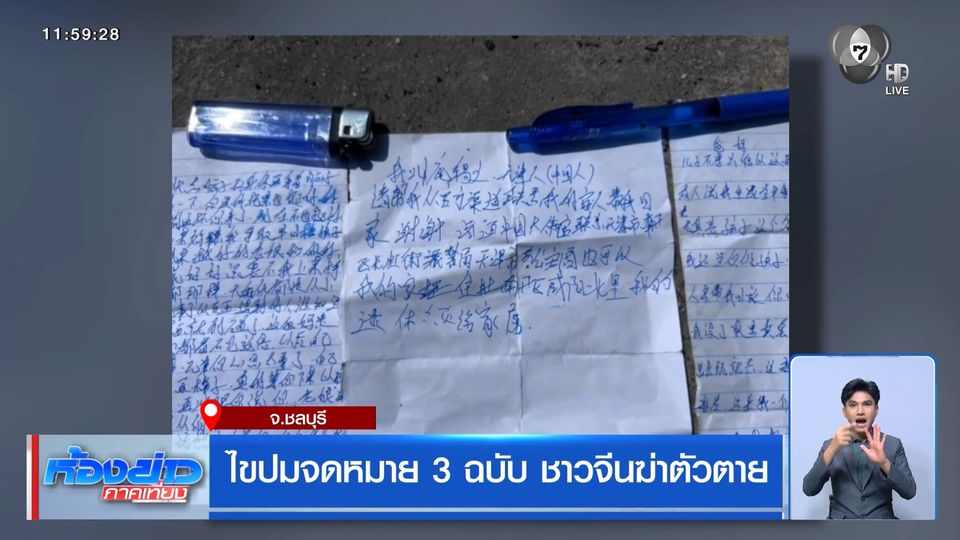 ห้องข่าวภาคเที่ยง - ตำรวจเผย หนุ่มชาวจีน ถูกแขวนคอ ที่แท้คาดว่าฆ่าตัวตาย หลังพบจดหมายลาโลก ขอโทษครอบครัว และขอให้ช่วยติดต่อสถานทูต นำร่างกลับไปหาพ่อแม่