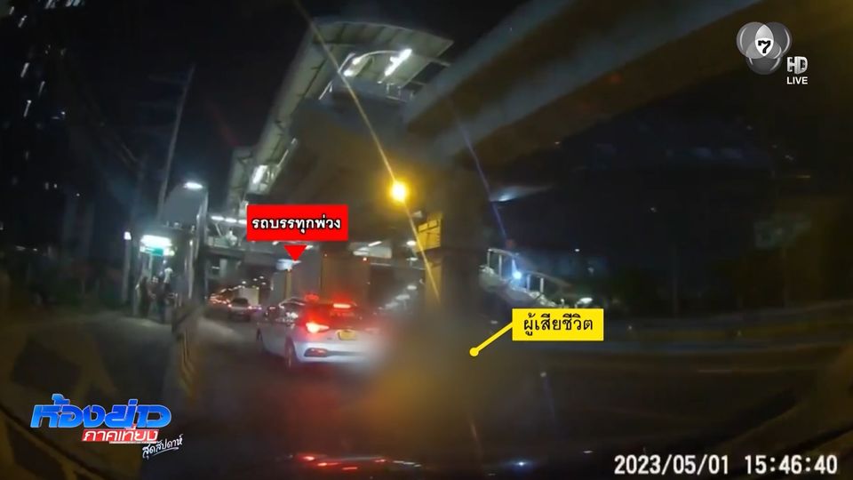 สักพักได้ยินเสียงชนรถ ก่อนสังเกตเห็นว่าที่หางพ่วง ทับบางอย่างจนตู้กระโดด แล้วร่างคนที่มากับรถจักรยานยนต์ 2 คน กลิ้งออกมาจากท้ายรถพ่วง ใกล้กันมีรถจักรยานยนต์ล้มอยู่ข้าง ๆ ส่วนรถบรรทุกพ่วง ขับหนีไปโดยไม่จอดลงมาดู
