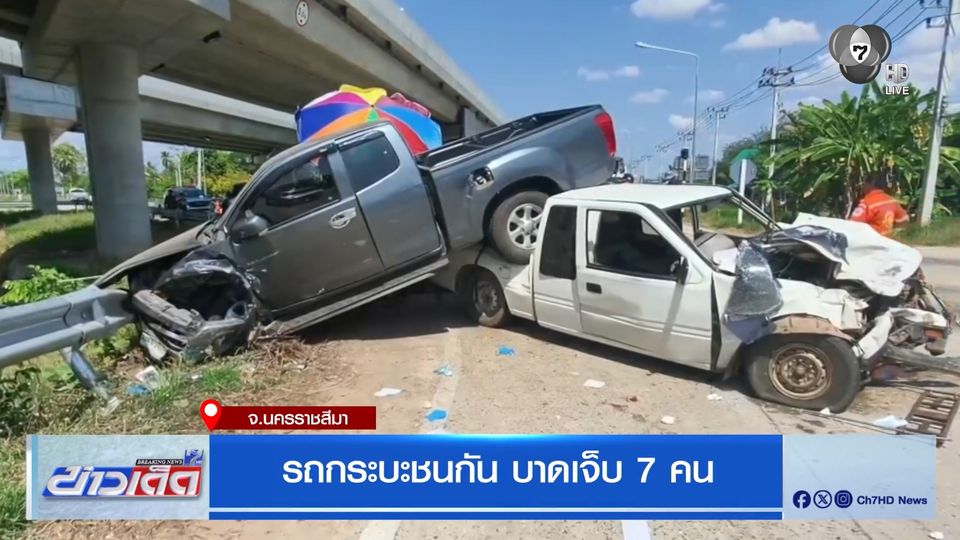ข่าวเด็ด 7 สี - ที่นครราชสีมา เกิดเหตุรถกระบะ 2 คัน พุ่งชนกันอย่างแรง ส่งผลให้มีผู้บาดเจ็บ 7 คน ชาวบ้านเผยจุดอันตราย เกิดอุบัติเหตุซ้ำซาก