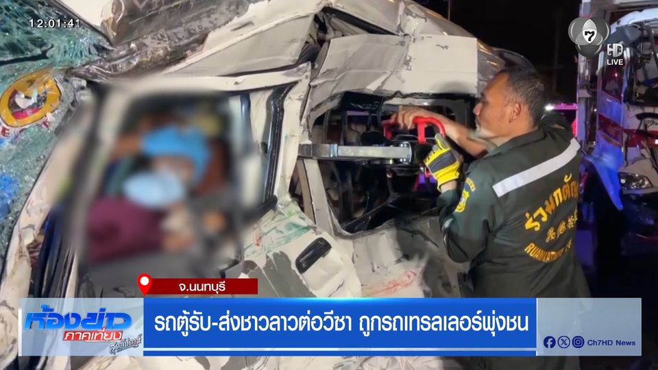 รถตู้รับ-ส่งชาวลาวต่อวีซา ถูกรถเทรลเลอร์พุ่งชน จ.นนทบุรี
