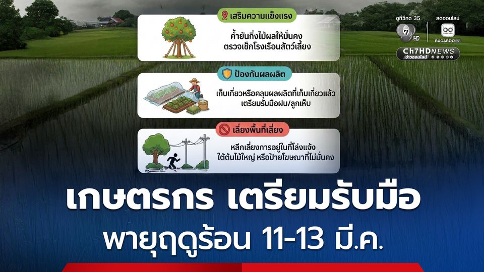 เตือนเกษตรกร ! เตรียมพร้อมดูแล ป้องกันพืชผลต้นไม้ สัตว์เลี้ยง ช่วง 11-13 มี.ค. เกิดพายุฤดูร้อน ลมกระโชกแรง ลูกเห็บตกบางแห่ง