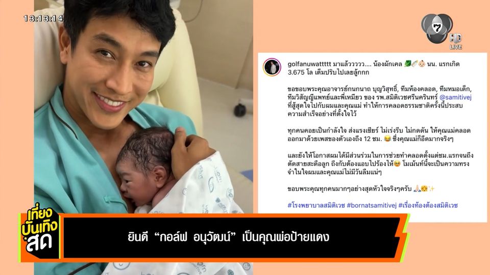 เที่ยงบันเทิงสด - ยินดีกับคุณพ่อป้ายแดง กอล์ฟ อนุวัฒน์ ล่าสุด ได้ลูกชายมาคล้องใจแล้ว ชื่อว่า น้องเคล กับน้ำหนักตัวแรกเกิด 3.675 กิโลกรัม ชื่อน้อง น้องเคล ผักเพื่อสุขภาพมาก สมเป็นคุณพ่อสายออกกำลังกายสุด ๆ