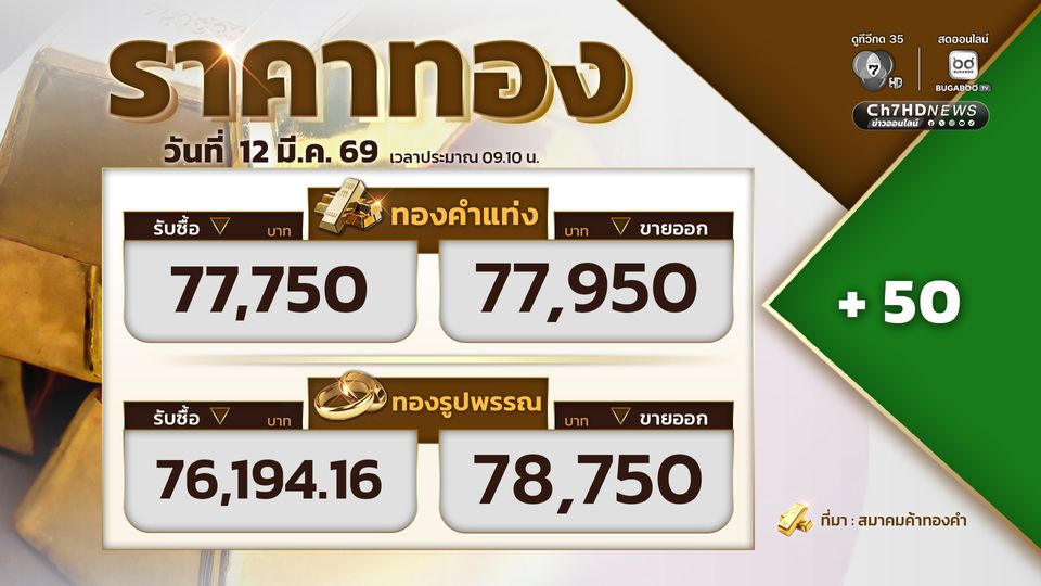 ราคาทอง โดยสมาคมค้าทองคำ รายงานราคาทองวันนี้ (12 มี.ค. 69) เปิดตลาดราคาทอง ราคาทองปรับขึ้น 50 ขายออกที่บาทละ 77,950 บาท โดยทองคำแท่งรับซื้อที่ 77,750 บาท ขายออกที่ 77,950 บาท ทองรูปพรรณรับซื้อที่ 76,194.16 บาท ขายออก 78,750 บาท