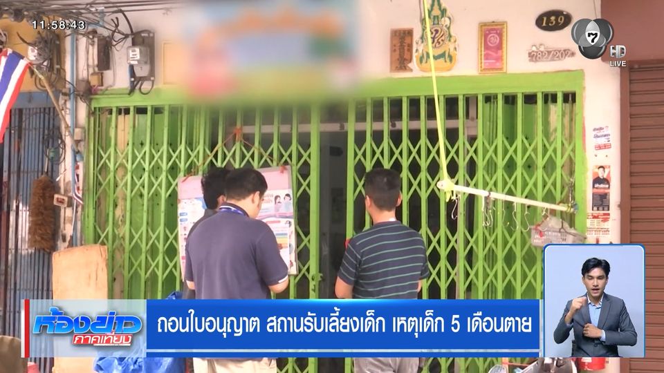 ห้องข่าวภาคเที่ยง - ความคืบหน้าการเสียชีวิตของเด็ก 5 เดือน ตอนนี้เจ้าหน้าที่ตำรวจ กำลังรอผลตรวจชิ้นเนื้อ เพื่อคลี่ปมการเสียชีวิตปริศนาในสถานรับเลี้ยงเด็ก ด้านกรมกิจการเด็กและเยาวชน สั่งถอนใบอนุญาตสถานรับเลี้ยงเด็ก เพราะไม่ปฏิบัติตามกฎกระทรวง
