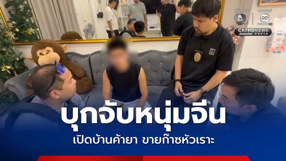 หลังจากนั้น ได้มีรถจยย. คันหนึ่งได้ขับมาจอดหน้าบ้าน ก่อนที่ชายชาวจีนจะเดินออกมาจากรั้วบ้านพร้อมกล่องบรรจุ ก๊าซหัวเราะ 1 ถัง เจ้าหน้าที่จึงแสดงตัวเป็นตำรวจตรวจคนเข้าเมืองเข้าควบคุมตัวทันที และเข้าตรวจค้นภายในบ้านพัก