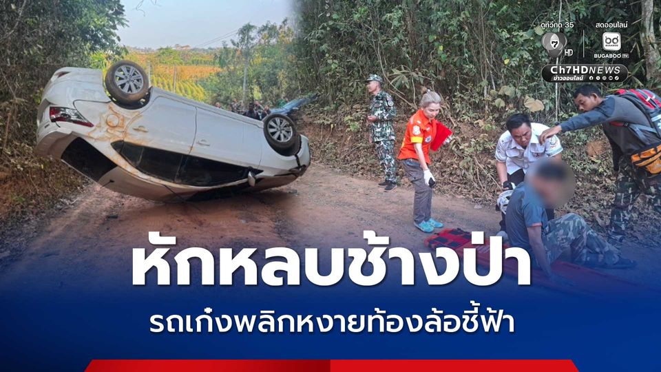 เจอช้างป่าออกมาหากิน 3 ตัว ชาวบ้านขับเก๋งเลยหักหลบจนรถพลิกหงายท้องล้อชี้ฟ้า ส่วนคนขับได้รับบาดเจ็บ