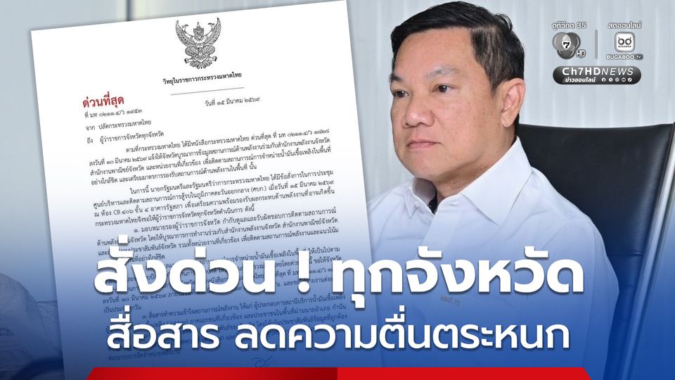 ค่ำวานนี้ (15 มี.ค.69) นายอรรษิษฐ์ สัมพันธรัตน์ ปลัดกระทรวงมหาดไทย ออกหนังสือสั่งการด่วน ภายหลังการร่วมประชุมศูนย์บริหารและติดตามสถานการณ์การสู้รบในภูมิภาคตะวันออกกลาง (ศบก.) โดยมี นายอนุทิน ชาญวีรกูล นายกรัฐมนตรีและรัฐมนตรีว่าการกระทรวงมหาดไทย เป็นประธานการประชุมที่ห้องประชุมอาคารรัฐสภา