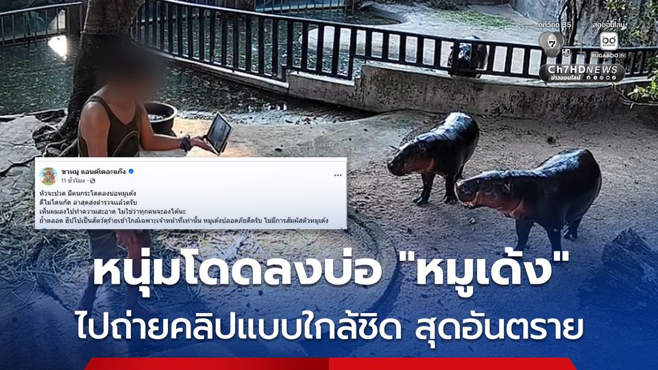 หนุ่มโดดลงบ่อ "หมูเด้ง" ไปถ่ายคลิปแบบใกล้ชิด ขาหมู แอนด์เดอะแก๊ง ย้ำ ทำแบบนี้สุดอันตราย เพราะฮิปโปฯ เป็นสัตว์ดุร้ายเข้าใกล้เฉพาะเจ้าหน้าที่เท่านั้น ล่าสุด รวบตัวชายคนดังกล่าว ส่งตำรวจดำเนินคดีแล้ว อยู่ระหว่างสอบสวนหามูลเหตุจูงใจ