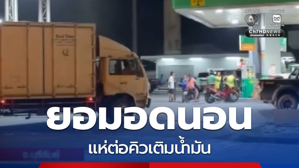 สนามข่าว 7 สี - วิกฤตน้ำมันขาดแคลนยังคงกระทบหลายพื้นที่ เมื่อคืนนี้ที่ จังหวัดบุรีรัมย์ ชาวบ้าน-เกษตรกรยอมอดนอน ขับรถยนต์ไปเข้าคิวรอเติมน้ำมันยาว แม้จะปรับขึ้นราคาอีกลิตรละ 50 สตางค์ ถึง 1 บาท