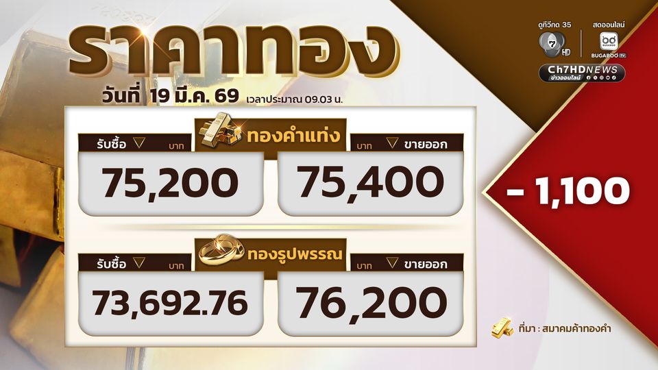 ราคาทอง โดยสมาคมค้าทองคำ รายงานราคาทองวันนี้ (19 มี.ค. 69) เปิดตลาดราคาทอง ราคาทองปรับลง 1,100 ขายออกที่บาทละ 75,400 บาท โดยทองคำแท่งรับซื้อที่ 75,200 บาท ขายออกที่ 75,400 บาท ทองรูปพรรณรับซื้อที่ 73,692.76 บาท ขายออก 76,200 บาท
