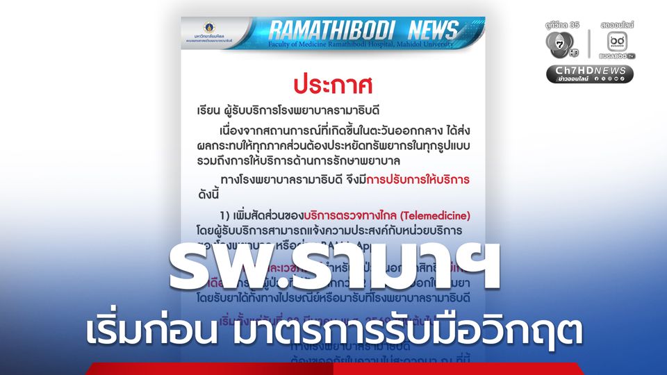 เริ่มแล้ว รพ.รามาฯ ประกาศมาตรการรับมือวิกฤตตะวันออกกลาง ประหยัดทรัพยากรทุกรูปแบบ เพิ่มการตรวจทางไกล Telemedicine จ่ายยา-เวชภัณฑ์ ผู้ป่วยนอกทุกสิทธิไม่เกิน 2 เดือน เริ่ม 23 มี.ค.นี้