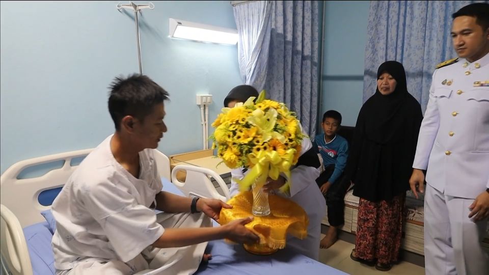 พระบาทสมเด็จพระเจ้าอยู่หัว พระราชทานดอกไม้และตะกร้าสิ่งของไปมอบแก่กำลังพลที่ได้รับบาดเจ็บจากเหตุคนร้ายใช้อาวุธสงคราม ที่จังหวัดปัตตานี
