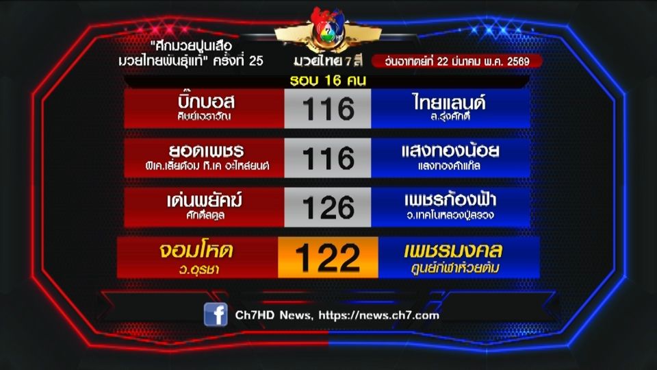 โปรแกรมมวยไทย 7 สี วันอาทิตย์ที่ 22 มีนาคม 2569 ถ่ายทอดสดช่อง 7HD เวลา 14.30 น.