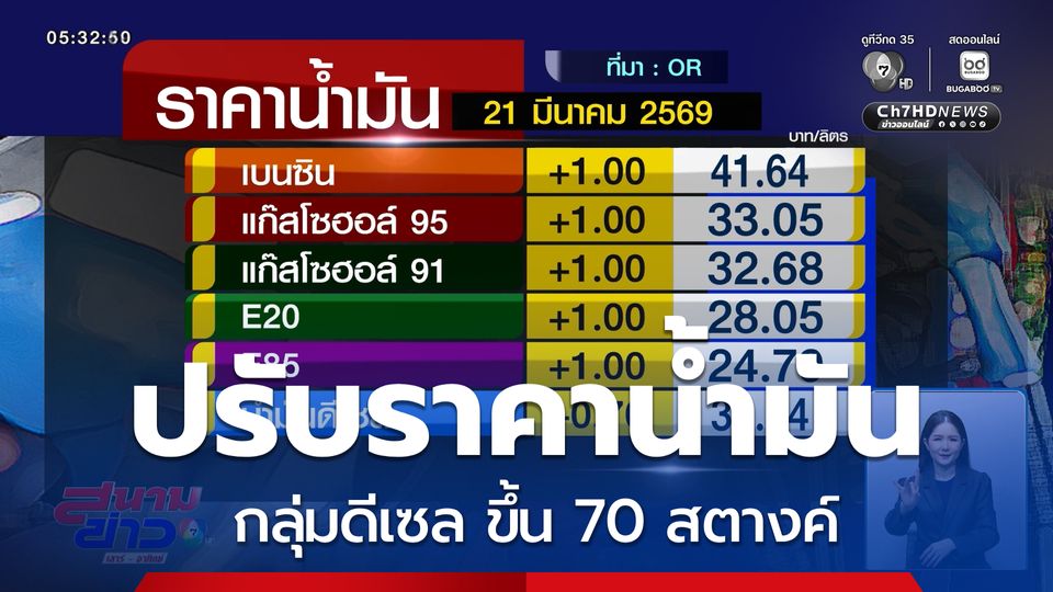 สนามข่าวเสาร์-อาทิตย์ - ประกาศปรับราคาน้ำมัน กลุ่มดีเซล ขึ้น 70 สตางค์ เบนซิน-แก๊สโซฮอล์ทุกชนิด ขึ้น 1 บาท มีผลตั้งแต่ 05.00 น.วันนี้ (21 มี.ค.) เป็นต้นไป