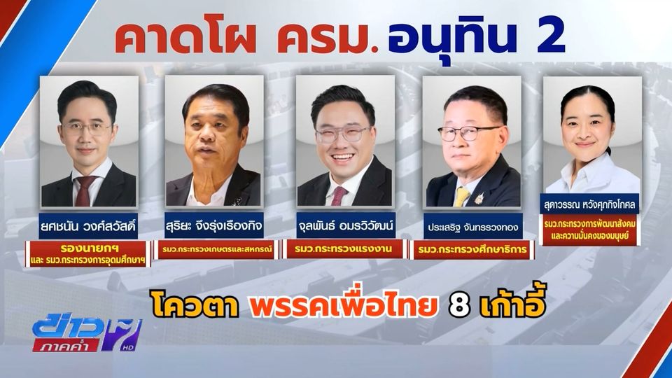 ข่าวภาคค่ำ - ความคืบหน้าการจัดทำโผคณะรัฐมนตรี ขณะนี้สัดส่วนรัฐมนตรี 8 ตำแหน่งของพรรคเพื่อไทยลงตัวหมดแล้ว พร้อมส่งให้ตรวจสอบประวัติแล้ว