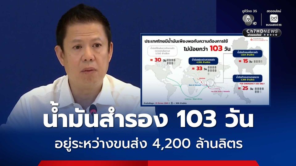อธิบดีกรมธุรกิจพลังงาน ยันไทยยังมีน้ำมันสำรอง 103 วัน อยู่ระหว่างขนส่ง 4,200 ล้านลิตร จัดหาจากทุกเส้นทางยืนยันแล้ว 3,700 ล้านลิตร เผยการใช้น้ำมันดีเซลยังสูงกว่าปกติ บางวันพุ่งถึง 100 ล้านลิตร ส่วนตรวจสอบบริษัทน้ำมันในอ่างทอง พบ ใบกำกับการขนส่งไม่ถูกต้อง