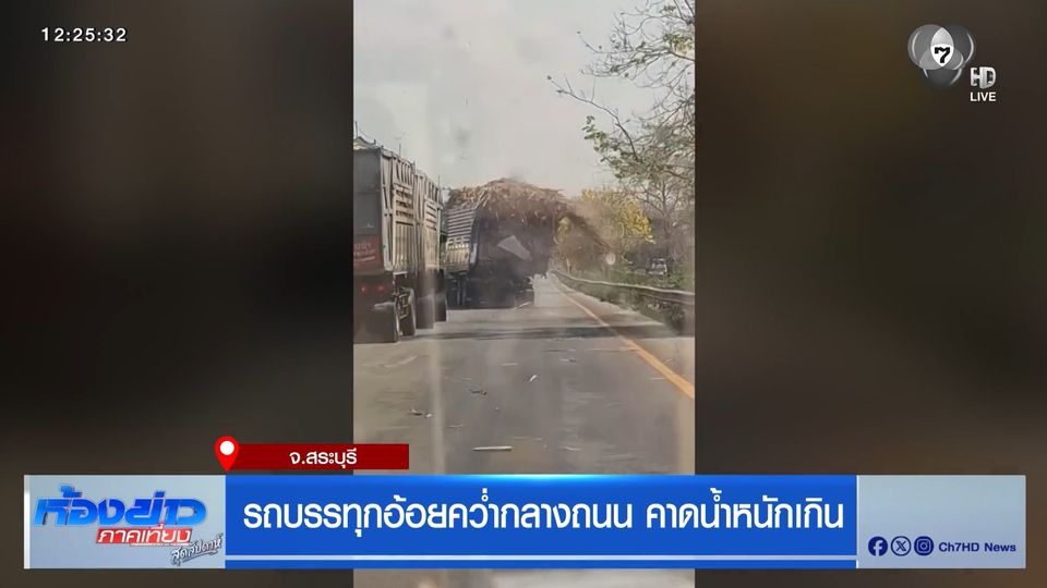 ห้องข่าวภาคเที่ยง สุดสัปดาห์ - ลุ้นแทน ขับรถตามหลังรถพ่วงบรรทุกอ้อย คล้ายบรรทุกจนน้ำหนักเกิน คนขับไม่รู้ตัว รถพ่วงเอียงไป-มา สุดท้ายคว่ำกลางถนน
