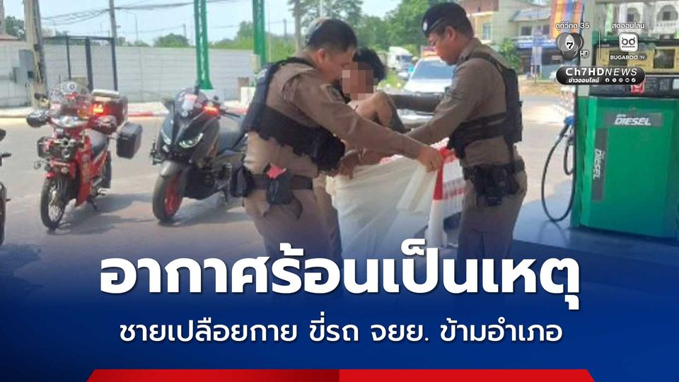 อากาศร้อนเป็นเหตุ ชายเปลือยกายขี่รถ จยย. ข้ามอำเภอ น้ำมันหมดกลางทาง เดินล่อนจ้อนเข้าปั๊มน้ำมัน โชคดีปั๊มน้ำมันหยุดให้บริการชั่วคราวเนื่องจากน้ำมันหมด จึงไม่เกิดความวุ่นวาย คาดอากาศร้อนทำให้อาการจิตเวชกำเริบ
