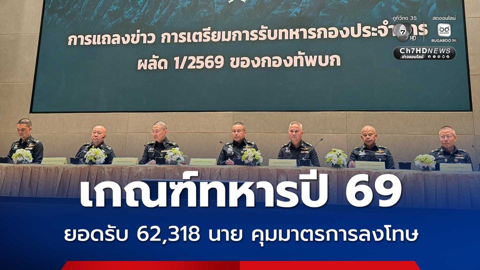 ทบ. เผยเกณฑ์ทหารปี 69 สมัครออนไลน์แล้ว 22,062 นาย เหลือยอดเกณฑ์อีก 62,318 นาย รับสิทธิประโยชน์ 11,000 บาทต่อเดือน คุมมาตรการลงโทษ ปลดล็อกเหยื่อบัญชีม้า
