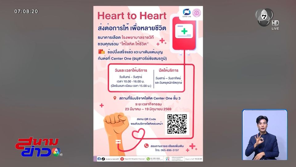 โรงพยาบาลราชวิถี ชวนทุกคนร่วมเป็นผู้ให้กับกิจกรรมบริจาคโลหิต "ให้โลหิต ให้ชีวิต" พบกันที่ Center One ชั้น 3 (อนุสาวรีย์ชัยสมรภูมิ) 23 มีนาคม - 19 มิถุนายน 2569 วันจันทร์-วันศุกร์ เวลา 10.00-16.00 น. (ลงทะเบียนได้ถึง 15.00 น.) ปิดวันเสาร์-อาทิตย์ และวันหยุดนักขัตฤกษ์