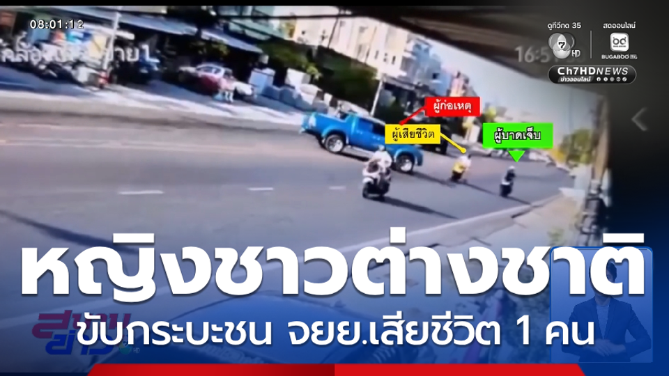 สนามข่าว 7 สี - เกิดเหตุสลดที่จังหวัดภูเก็ต หญิงชาวต่างชาติขับรถกระบะพุ่งข้ามเลนชนรถจักรยานยนต์ 2 คัน มีผู้เสียชีวิต 1 คน และบาดเจ็บอีก 1 คน
