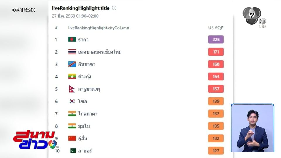เว็บไซต์ Iqair.com รายงานคุณภาพอากาศจากทั่วโลก ระบุ เทศบาลนครเชียงใหม่ มีดัชนีคุณภาพอากาศอยู่ที่ 171 ไมโครกรัม หรือ อันดับ 2 ของโลก