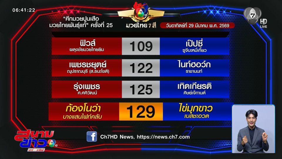โปรแกรมมวยไทย 7 สี วันอาทิตย์ที่ 29 มีนาคม 2569 ถ่ายทอดสดช่อง 7HD เวลา 14.30 น.