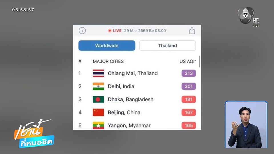 จากการตรวจสอบคุณภาพอากาศและการจัดอันดับเมืองที่มีมลพิษทั่วโลกแบบเรียลไทม์ของ IQAir เมื่อวาน พบเชียงใหม่ ติดอันดับ 1 เมืองที่มลพิษอากาศแย่ที่สุดในโลก โดยค่าฝุ่น PM 2.5 สูงถึง 221 ไมโครกรัมต่อลูกบาศก์เมตร ส่งผลกระทบต่อสุขภาพอย่างรุนแรง