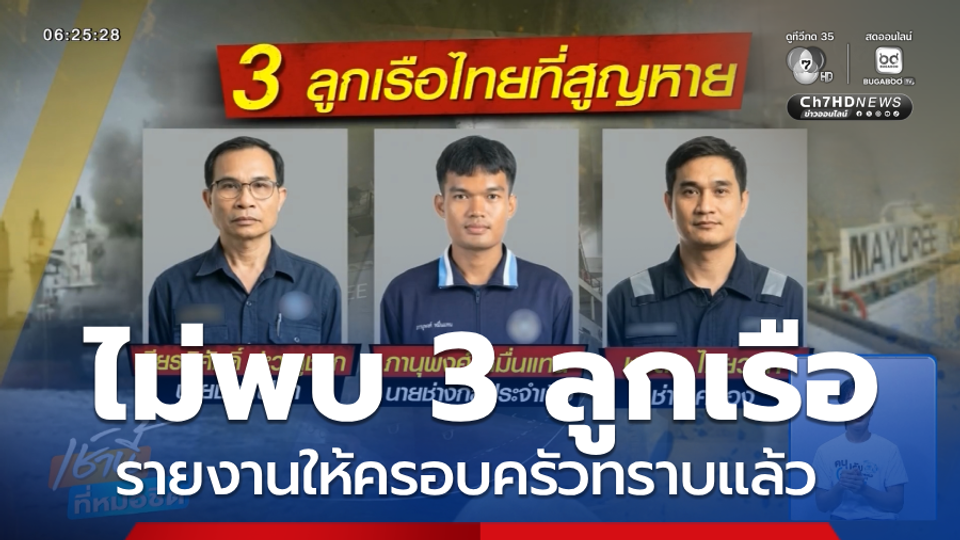 เช้านี้ที่หมอชิต - ไม่พบ 3 ลูกเรือมยุรีนารี กต.ได้รายงานให้ครอบครัวทราบแล้ว แต่ยังพยายามเดินหน้าประสานให้อิหร่านช่วยติดตาม