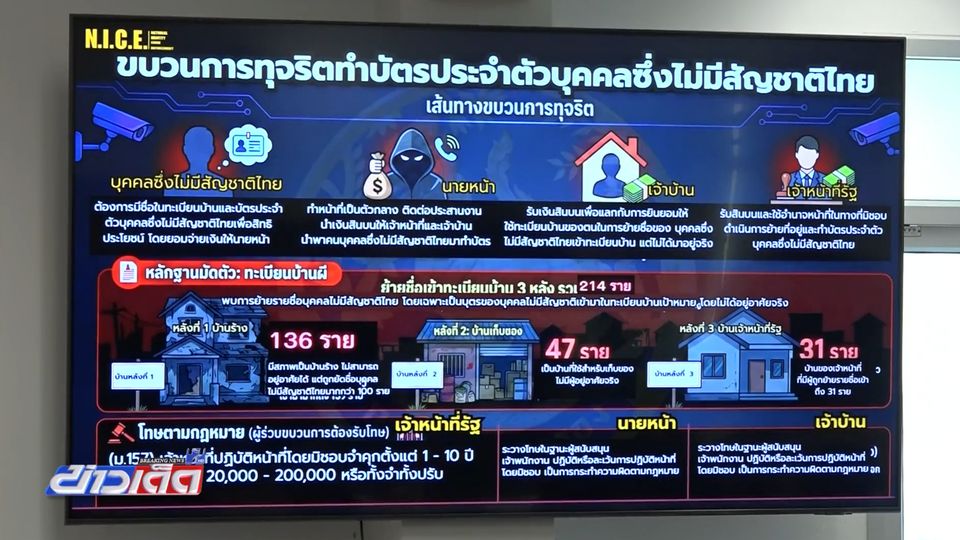 ขณะที่ ตัวแทนจาก 5 หน่วยงาน ร่วมกันแถลงสรุปผลปฏิบัติการ ยืนยันพบความผิดปกติจากการย้ายชื่อบุคคลต่างชาติ เข้าไปในทะเบียนบ้าน 3 หลัง รวมมากกว่า 200 รายชื่อ แลกกับการจ่ายค่าตอบแทน 1,000-3,000 บาท ต่อบุคคลต่างชาติ 1 คน โดยที่ไม่มีการอาศัยอยู่จริง เบื้องต้นได้จับกุมผู้ต้องหา 6 คน ขณะนี้อยู่ระหว่างการขยายผลสอบสวน