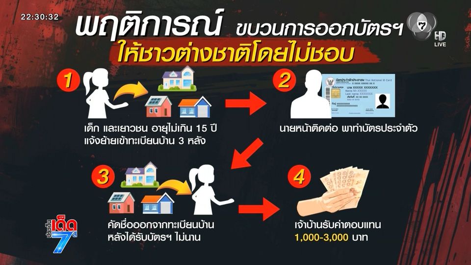 พบความผิดปกติ ตั้งแต่การย้ายชื่อบุคคลต่างชาติ เข้าไปในทะเบียนบ้าน 3 หลัง รวมมากกว่า 200 รายชื่อ แลกกับการจ่ายค่าตอบแทน 1,000-3,000 บาท ต่อบุคคลต่างชาติ 1 คน โดยที่ไม่มีการอาศัยอยู่จริง และทันทีที่เด็ก ๆ เหล่านี้ได้รับบัตรแล้ว ก็จะย้ายออกจากบ้านหลังนั้น ๆ ทันที
