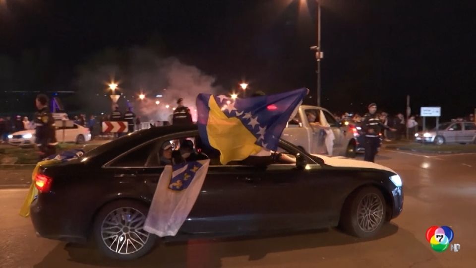 แฟนบอลจำนวนมากออกมาเฉลิมฉลองตามท้องถนนในเมืองเซนิกา หลังจากทีมบอสเนียและเฮอร์เซโกวีนา เขี่ยอิตาลีตกรอบเพลย์ออฟ ผ่านเข้ารอบสุดท้ายฟุตบอลโลก 2026