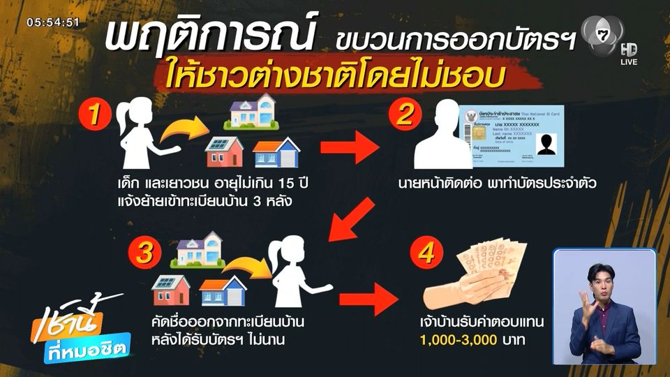 พอเด็ก ๆ ได้บัตรมาแล้ว ถึงจะไปย้ายชื่อเด็ก ๆ เหล่านี้ออกจากทะเบียนบ้าน 3 หลัง แล้วค่อยมอบค่าตอบแทนให้เจ้าบ้านรายละ 1,000-3,000 บาท ต่อรายชื่อเด็ก 1 คน ส่วนเงินที่รับจ้างมาจริง ๆ สูงถึงรายละกว่า 10,000-30,000 บาท