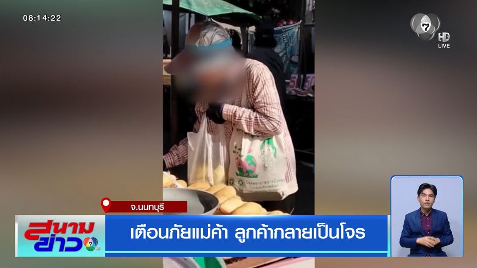 สนามข่าว 7 สี - จังหวัดนนทบุรี มีคลิปเตือนภัยแม่ค้าขายผลไม้ เพราะมีผู้หญิงคนหนึ่งทำทีเป็นลูกค้าซื้อมะม่วงสุก พอแม่ค้าเผลอ ลงมือทันที
